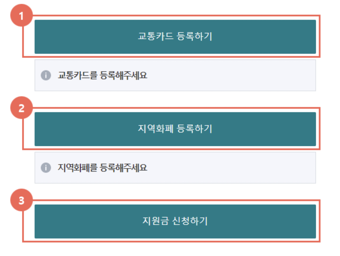 회원가입을 완료했다면 이제 지원금 신청에 필요한 교통카드와 지역화폐를 등록해야 한다. 교통카드 및 지역화폐정보를 등록하지 않으면 지원금 지급이 불가하기 때문에 꼭 꼭 신청까지 체크하시기 바란다.