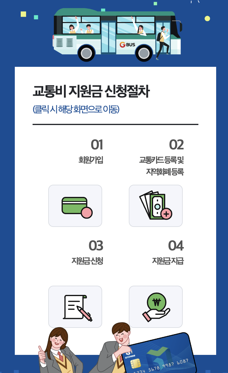 교통비 신청절차는 회원가입 → 교통카드 등록 및 지역화폐등록 → 지원금 신청 → 지원금 지급 순으로 진행된다.