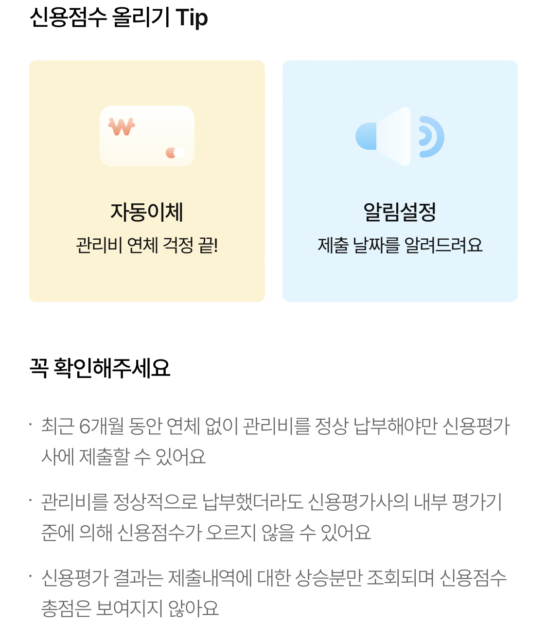 - 관리비를 정상적으로 납부했더라도 신용평가사의 내부 평가기준에 의해 신용점수가 오르지 않을 수 있다