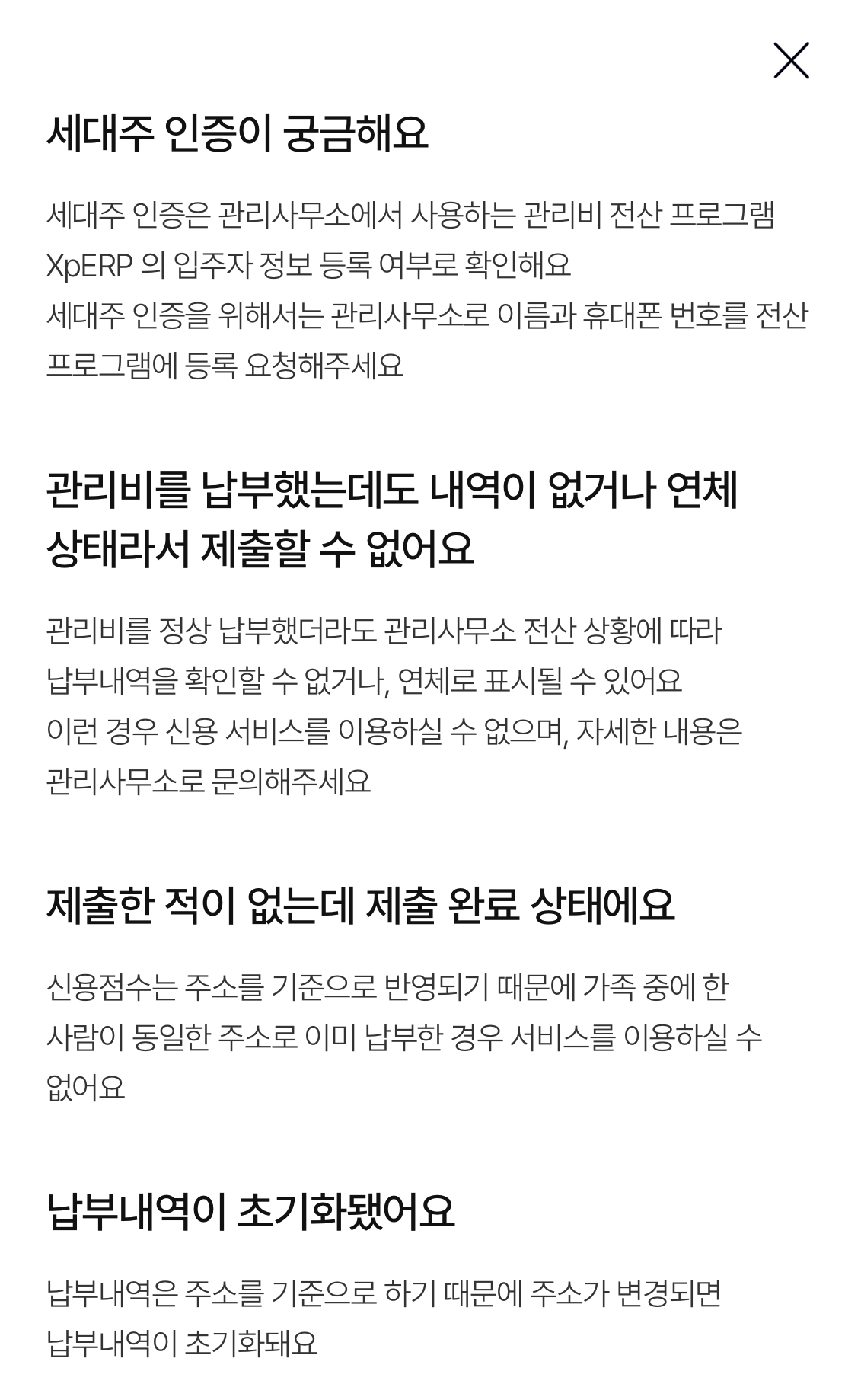 - 관리비납부 내역: 관리비를 정상 납부했더라도 관리사무소 전산 상황에 따라 납부내역을 확인할 수 없거나, 연체로 표시될 수 있다. 이런경우 신용서비스를 이용할 수 없고 자세한 내용은 관리사무소로 문의해야 한다.