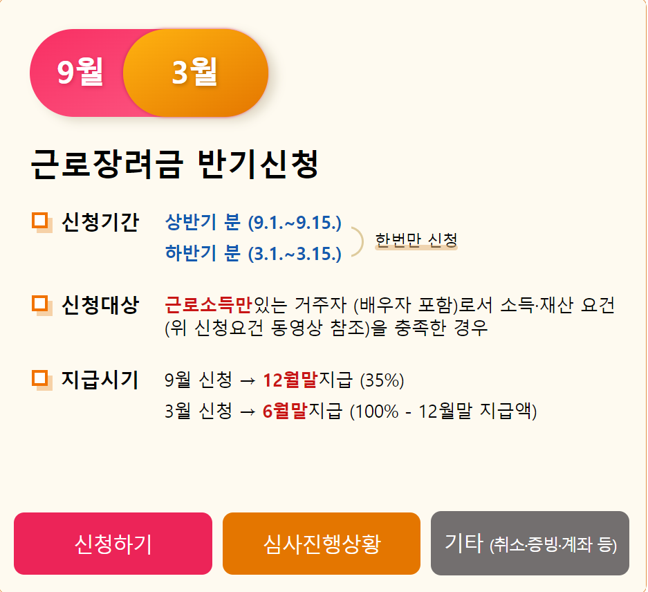 근로장려금은 소득과 재산이 일정금액 미만인 근로자, 종교인, 사업자(전문직 제외) 가구에 대해 일하는 만큼 가구원 구성과 총 급여액 등 (부부합산)에 따라 산정된 근로장려금을 지원하여 근로를 장려하고 소득을 지원하는 일과 연계된 복지제도이다. 되든지 안되든지 좋은 제도가 있으니 신청자격 구간에 있으신 분들은 아래 링크를 통해 빠르게 신청부터 하세요. 먼저 접수한 분들의 순서대로 진행돼요