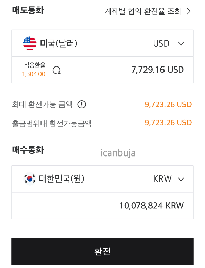 세상에 그런데 왠일인가. 매도하는 환율 즉, 파는 환율은 1달러에 1304원이 되었고 환전하니 대략적으로 78,824월의 환차익이 발생된것 아닌가. 사는 환율과 파는 환율의 차이가 10원이면 78000원의 환차익이 발생하니 20원이라면 156천원의 환차익이 생기는 것이다. 금방 필요한 금액은 아니라 달러가 조금 오르는 방향을 탔으니 30원정도 더 오르면 매도할 예정이다.