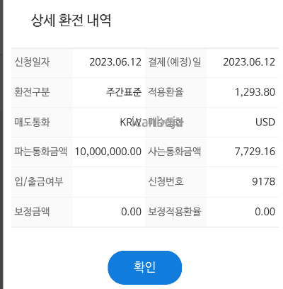 얼마전 달러를 살 일이 있어 1달러에 1293.80원에 대략 일천만원을 미화로 매입했다. 환전하니 7,729.16달러 교환이 됐고 생각한대로 사용할 일이 없어 오늘 다시 원화로 바꾸려 환율 계산을 해보았다.