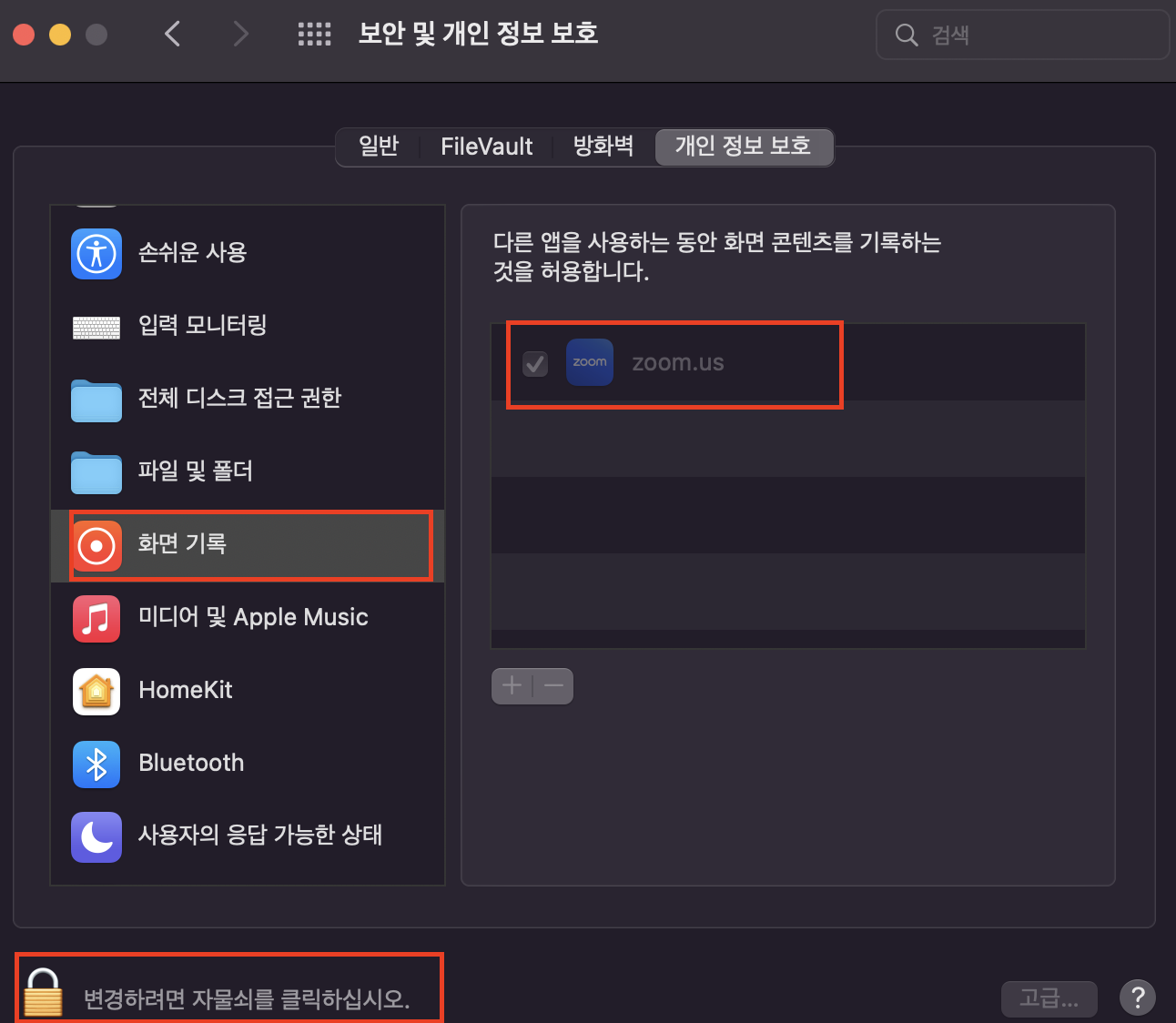 개인정보 보호 목록에 들어가면 화면기록이 나오고 다른 앱을 사용하는 동안 회면 콘텐츠를 기록하는 것을 허용한다는 문구 아래 줌 앱을 체크해준다. 체크가 안되는 이유는 아래 변경하기위해 자물쇠가 묶여있어서이다. 미리 설정한 암호나 터치ID로 보안을 풀고 줌앱을 체크한다.