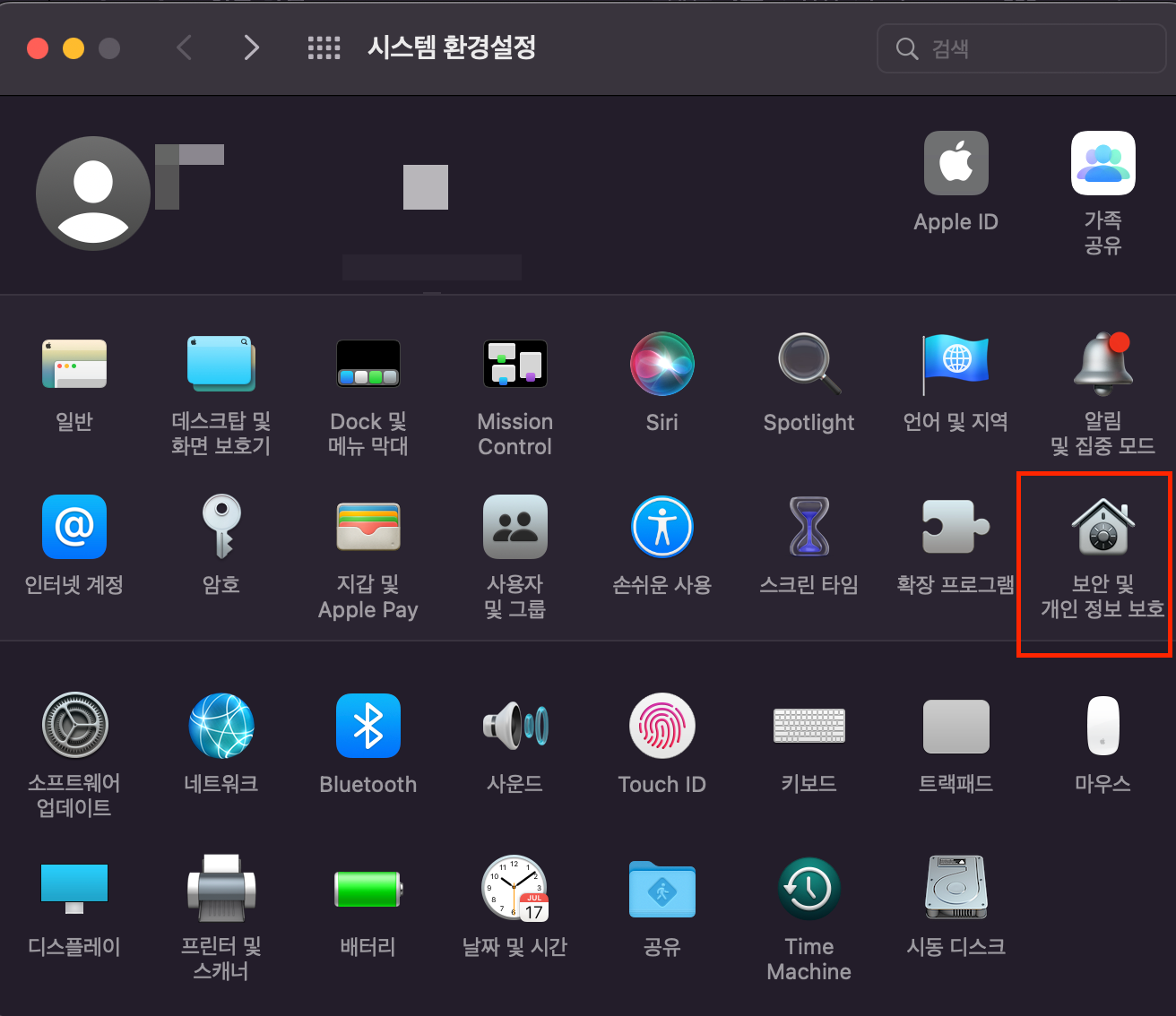 환경설정에 들어가면 보안 및 개인정보 보호 목록이 있다.