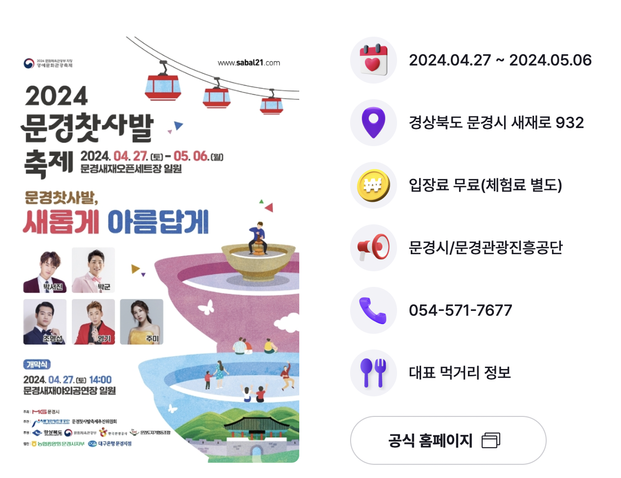 가정의 달 5월에 아이들과 온가족이 함께 체험과 볼거리가 다양하게 준비되어 있으니 문경의 아름다운 경치와 함께 즐거운 추억을 많이 만드시길 바란다.