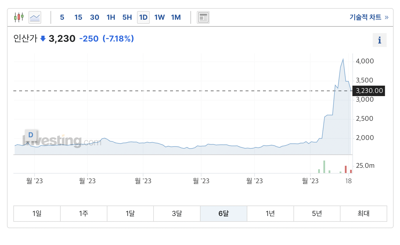 최근 일본의 오염수 방류 소식이 전해질때마다 큰 폭의 상승이 잇었다. 실제 지난 7일 일본이 오염수 방류를 위한 해저 터널에 바닷물 주입 작업이 완료됐다는 소식이 전해지면 인산가의 주가는 28% 오르기도 했다.