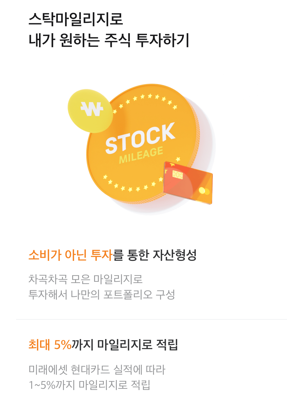 ▶현대카드: 미래에셋 현대카드를 발급하고 사용을 통해 적립한다. 카드사용금액의 1~5% 스탁마일리지가 적립된다.