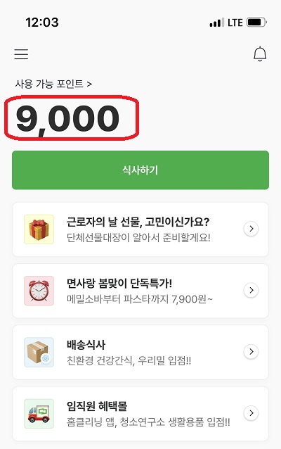 회원가입은 회사에서 제공하는 주소로 어플설치 후 로그인한다. 이 때 개인적인 회원가입이 되는 것이 아니라 회사에서 가입하고 사용자들은 회사에서 제공한 ID와 암호로 로그인할 수 있다. 로그인 하면 다음과 같은 포인트가 입금되어있다.