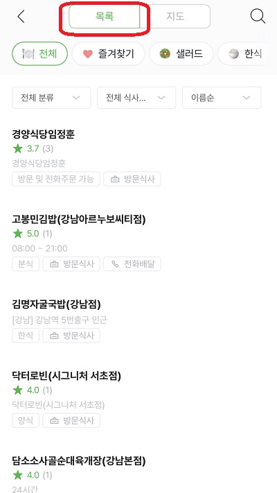 식권대장으로 사용할 수 있는 목록을 지도나 양식, 일식, 중식 순으로 검색할 수 있다. 이 중에 골라 방문한다.