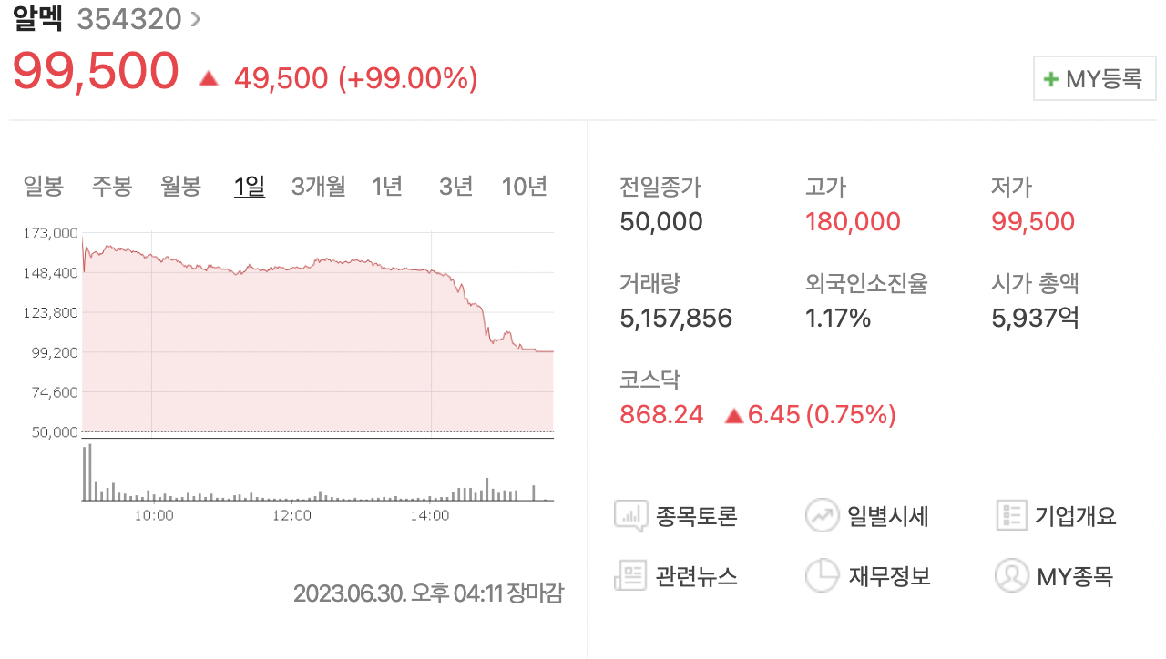 코스닥 시장에 알멕은 공모가 5만원 대비 99% 상승한99,500원에 거래를 마쳤다. 개장 직후 공모가 대비 260%오른 18만원을 기록했으나 오후 2시부터 매도 물량 출회되며 상승폭을 되돌리기 시작했다.