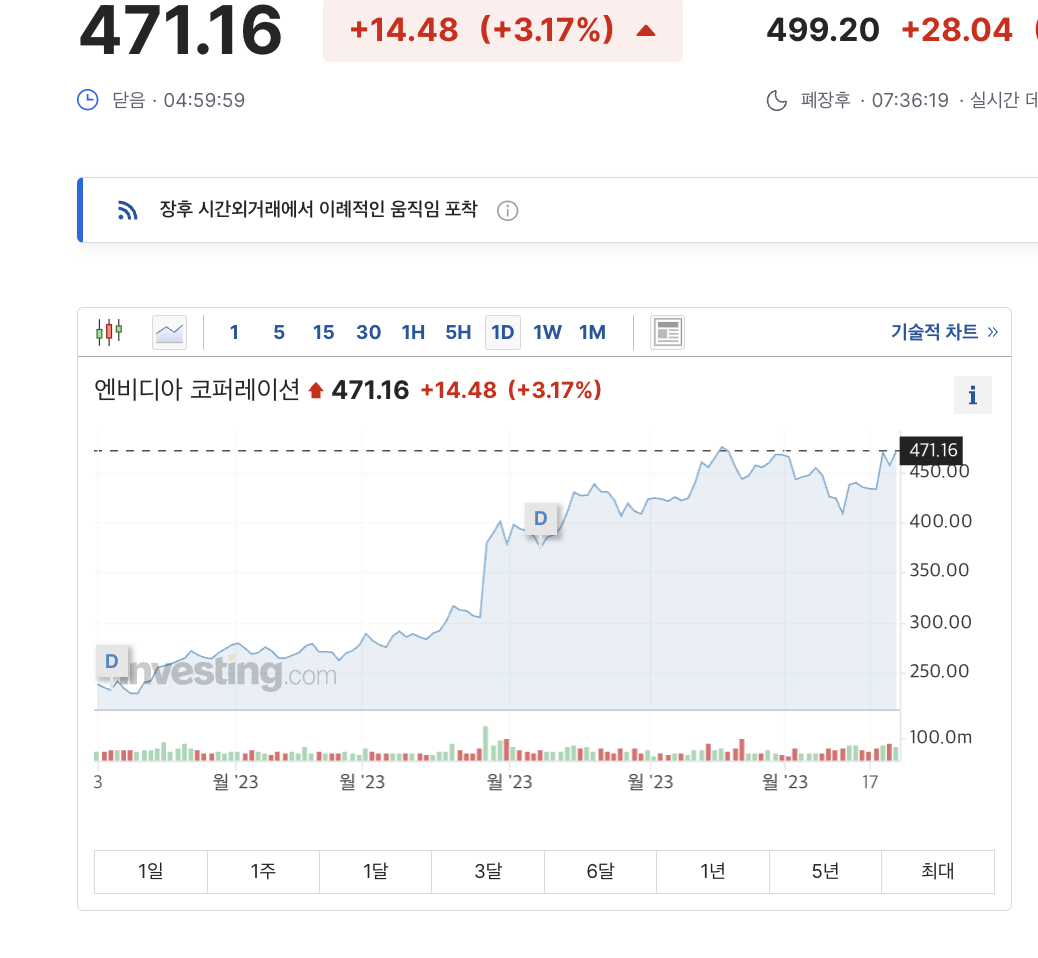 3분기 실적발표 이후 엔비디아의 주가도 급등했는데 시간외거래에서 8% 급등했다. 시간외거래에서 508.75 달러 정규장에서 3.17% 상승마감했다. 엔비디아의 주가가 그야말로 사상 최고치를 경신할 전망이다.