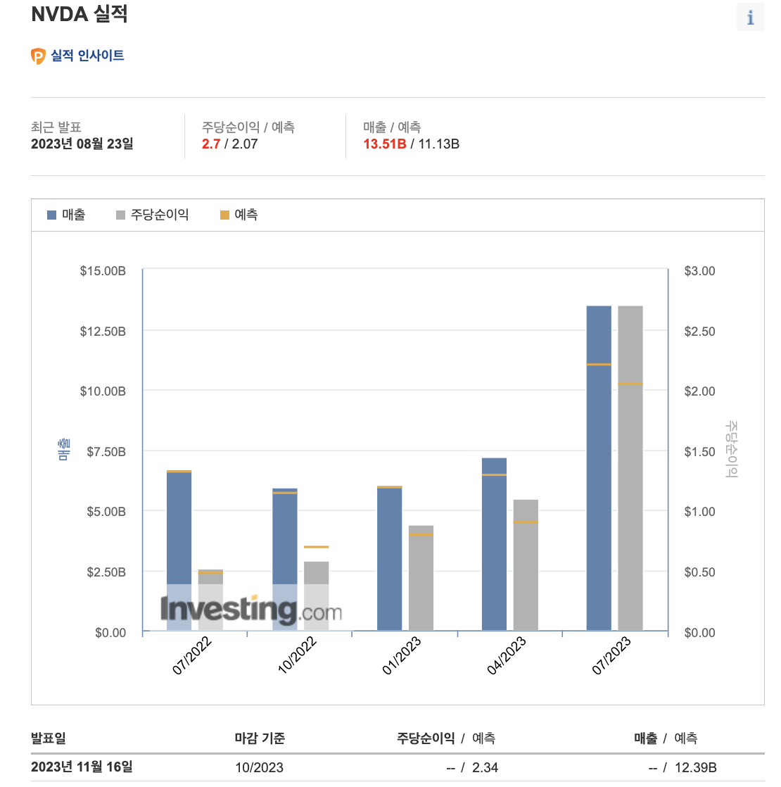 나스닥을 이끌고 있는 엔비디아가 2023년 8월23일 실적을 발표했다. 주당 2.7달러의 분기당 주당 순익은 시장이 에상한 2.07을 크게 웃돈다. 3분기 실적 발표후 주가도 500달러를 돌파했다.