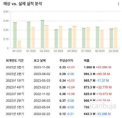 주당순이익을 보면 23년 2분기보다 상향된 것을 확인할 수 있다. 매출액은 21년 이후 꾸준히 우상향하고 있는 모습이다.