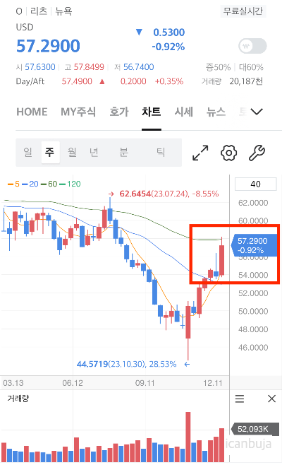 리얼티인컴의 현재주가는 2023년 12월 18일 전일종가 1주당 $ 57.29이다.