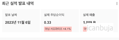 주당순이익을 보면 23년 2분기보다 상향된 것을 확인할 수 있다. 매출액은 21년 이후 꾸준히 우상향하고 있는 모습이다.