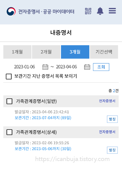 보관기관이 나오는데 가족관계증명서나 기본증명서, 등본 등은 유효기간이 3개월이다. 보관기관도 유효기간에 맞추어 보이다 해당기간이 만료되면 사라진다. 다시 발급받아야 한다.