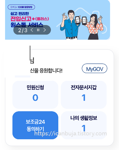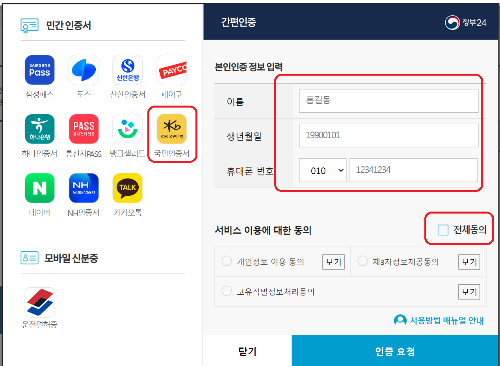 정부 24 어플을 들어가면 예전에는 공인인증서(현재 공동인증서)로 로그인하는 일이 여간 번거로운 게 아니었다. 이유는 1년마다 갱신해야 하고 복잡한 비밀번호 눌러야 했는데 이제는 토스, 삼성패스, 국민모바일인증서, 하나, 네이버, 카카오 등 간편 인증서로도 로그인이 가능해졌다. 원하는 간편인증 중에 하나를 선택하고 이름, 생년월인, 휴대폰번호를 입력한 후 인증요청을 누르면 해당인증서 어플로 알람이 온다. 예를 들어 국민 인증을 선택하면 스타뱅킹 어플로 알람이 오고 알람을 클릭하여 스타뱅킹 간편 인증을 한 후 다시 정부 24로 들어가 인증완료 버튼을 눌러주면 된다.