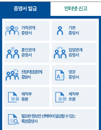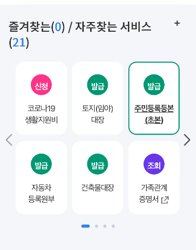 로그인 후 화면 하단에 자주 찾는 서비스에 사람들이 가장 많이 열람하는 증명서 중에 선택해도 되고 검색창에 검색해서 찾아도 된다. 가족관계 증명서, 기본증명서, 혼인관계 증명서, 입약관계 증명서, 등본, 제적등본, 납세증명, 격리통지서 등 코로나 관련 증명서까지 대부분의 필요한 종류의 증명서는 다 된다고 보면 된다.