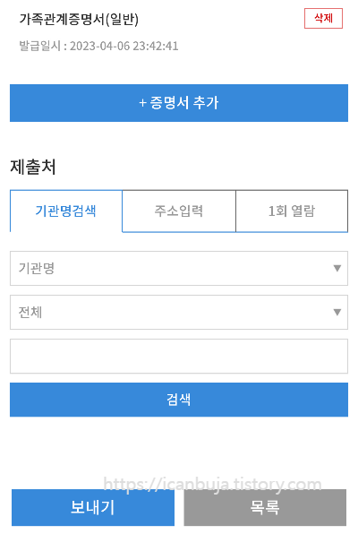 발급받은 전자증명서를 파일로 저장해서 메일로 보낼 필요 없이 바로 보내기가 가능하다. 예를 들어 금융기관으로 보내야 한다면 위의 사진처럼 기관명 검색하여 보내기를 하면 된다. 해당기관에서 알아서 사용하니 번거로운 절차 없이 간편하게 공공증명서를 전송할 수 있다.