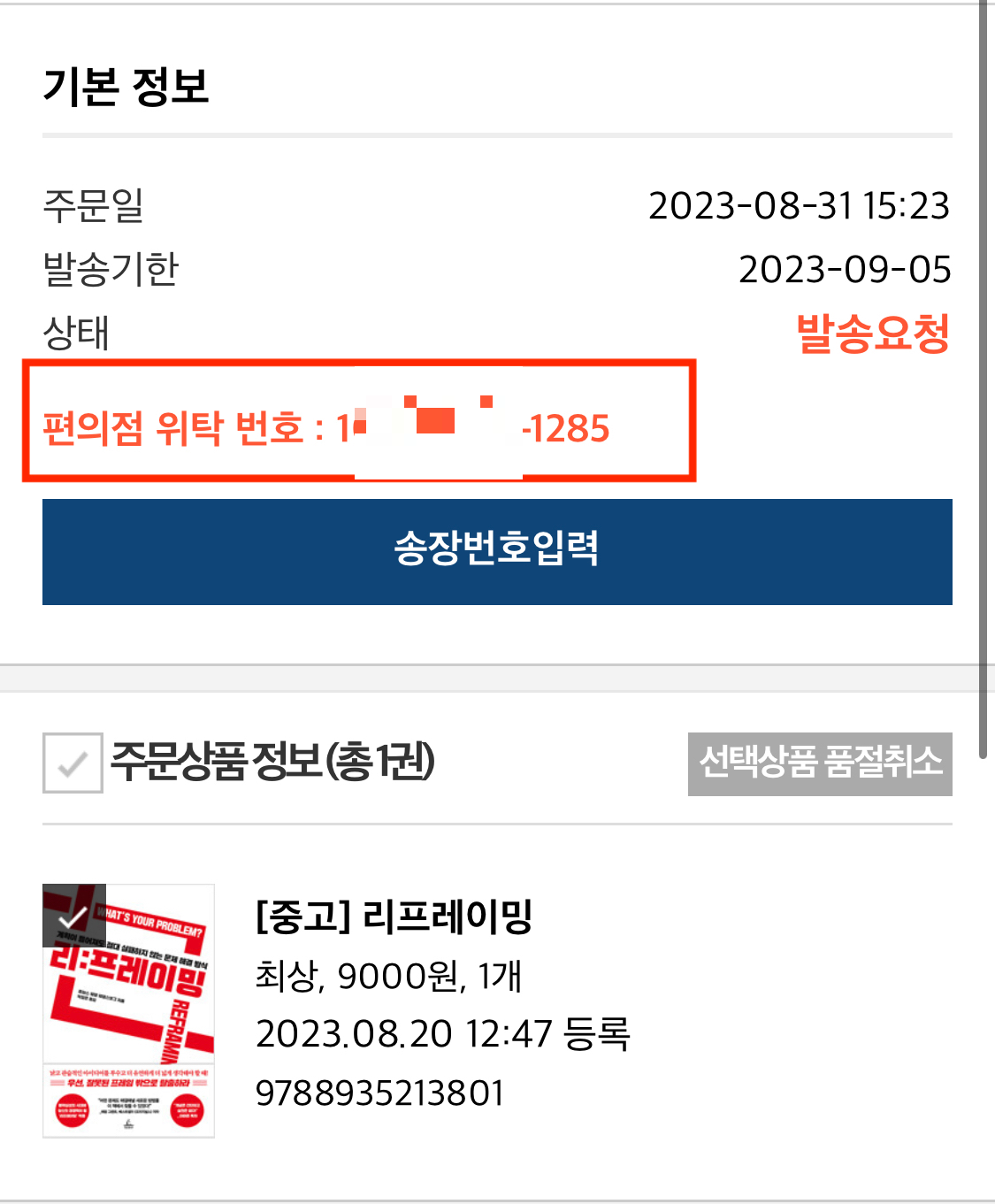 집 가까운 편의점에 들러 편의점 택배를 이용할 때 쇼핑몰택배-송장번호(위탁번호 입력)-운송장출력- 포장한 책에 붙이기-점원에게 보여주면 바코드를 찍고 택배함에 넣기만 하면 된다. 서점에 가지 않아도 되고 집에서 편리하게 발송할 수 있으니 중고책을 팔고 돈도 벌었다.