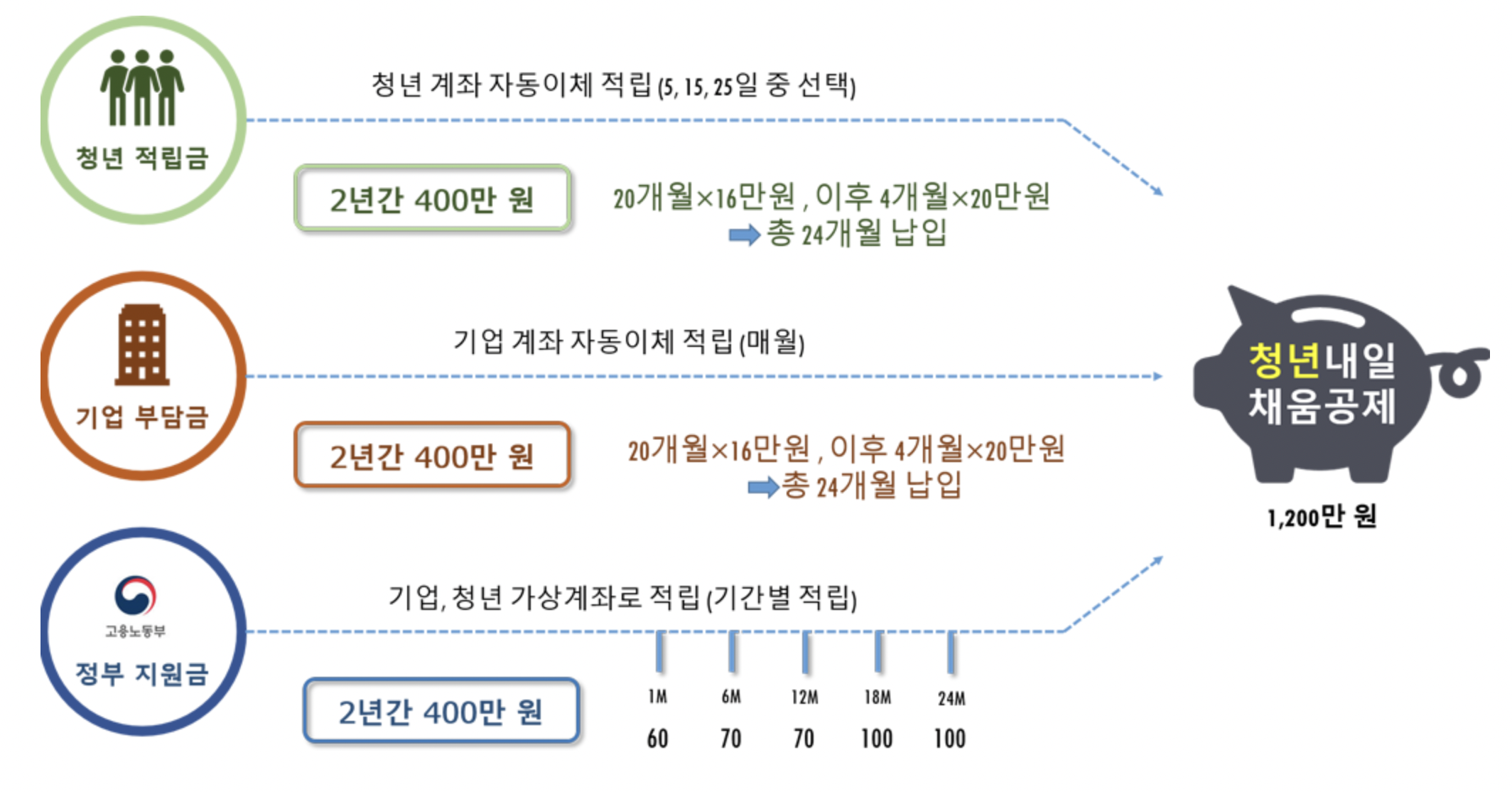 청년 본인이 2년간 400만원(20개월간 16만원,이후 4개월간 20만원)을 적립하면 기업이 400만원과 정부가 400만원을 공동 적립하여 2년 후 만기 공제금이 1200만원+@를 지원하게 된다. 이 때 최소 2년 동일 사업장에서 근무하면서 실질적 경력 형성의 기회를 가질 수 있으며 만기 후 중소기업벤처기업부의 내일채움공제(3년~5년)로 연장가입도 가능하다.