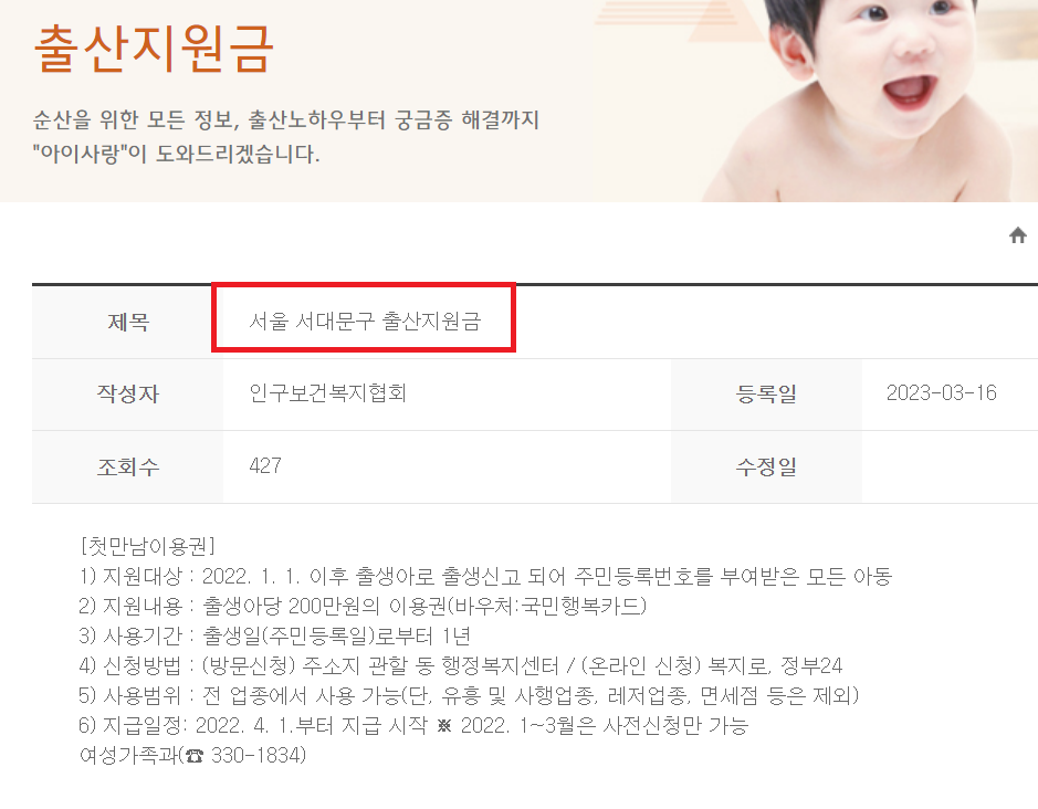 서울 서대문구의 경우 , 출생아동당 200만원의 국민행복카드의 바우처 형태로 이용권이 지급된다. 출생일부터 1년간 이용할 수 있고 전 업종에서 사용이 가능하다 (단, 유흥 및 사행업종, 레저업종, 면세점 등은 제외된다) . 신청방법은 복지로와 정부24에서 온라인신청하시거나 주소지 관할 동 행복복지센터에서 방문신청도 가능하다.