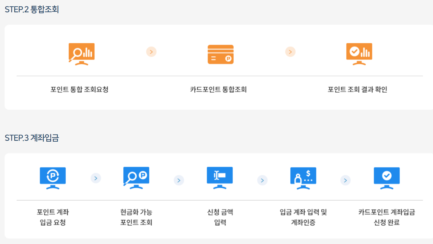 포인트 계좌 입금요청 → 현금화 가능 포인트 조회 → 신청 금액 입력 → 입금계좌 입력 및 계좌인증 →카드 포인트 계좌입금 신청완료