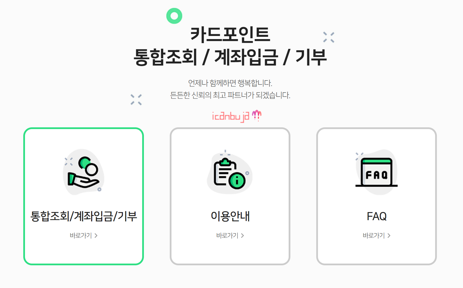 홈페이지나 앱으로 이용가능하며 카드포인트 통합조회는 매일 00:00~24:00시 이용가능하다. 카드 포인트 계좌입금 서비스 시간은 서비서 점검 시간으로 인해 매일 00:3.~22:30이고 카드사별로 1일 1회만 계좌입금 신청이 가능하니 유의하시기 바란다
