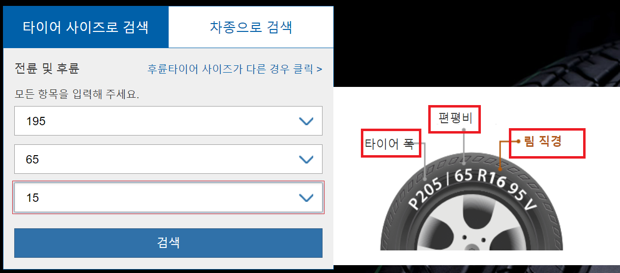 2. 자동으로 검색하거나 타이어 사이즈로 검색하는 방법으로 차에 맞는 타이어를 찾는다.