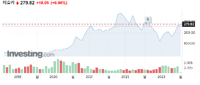 테슬라의 실적을 살펴보자. 지난 1월 미국 내 판매가격 인하를 단행한 것을 시작으로 전기차 업계의 가격 경쟁력을 줄곧 주도해왔다. 미국 시장뿐 아닌 유럽과 중국, 일본, 한국까지 판매 가격을 낮췄다. 모델 Y의 경우 판매가격의 20%이상 떨어졌고 모델 3의 판매가격은 11%나 인하했다. 이러한 흐름에 이어 전년도 같은 기간 대비해서 46만 6천대를 인도하며 83%의 2분기 실적을 올릴 수 있었다. 2023년 초반 테슬라 주가 역시 폭락을 이어오다 서서히 회복세를 타는 이유이다. 400달러를 넘던 2021년 11월 수준까지는 아니지만 현재 279.82로 점진적인 의미있는 상승을 이어갔다.