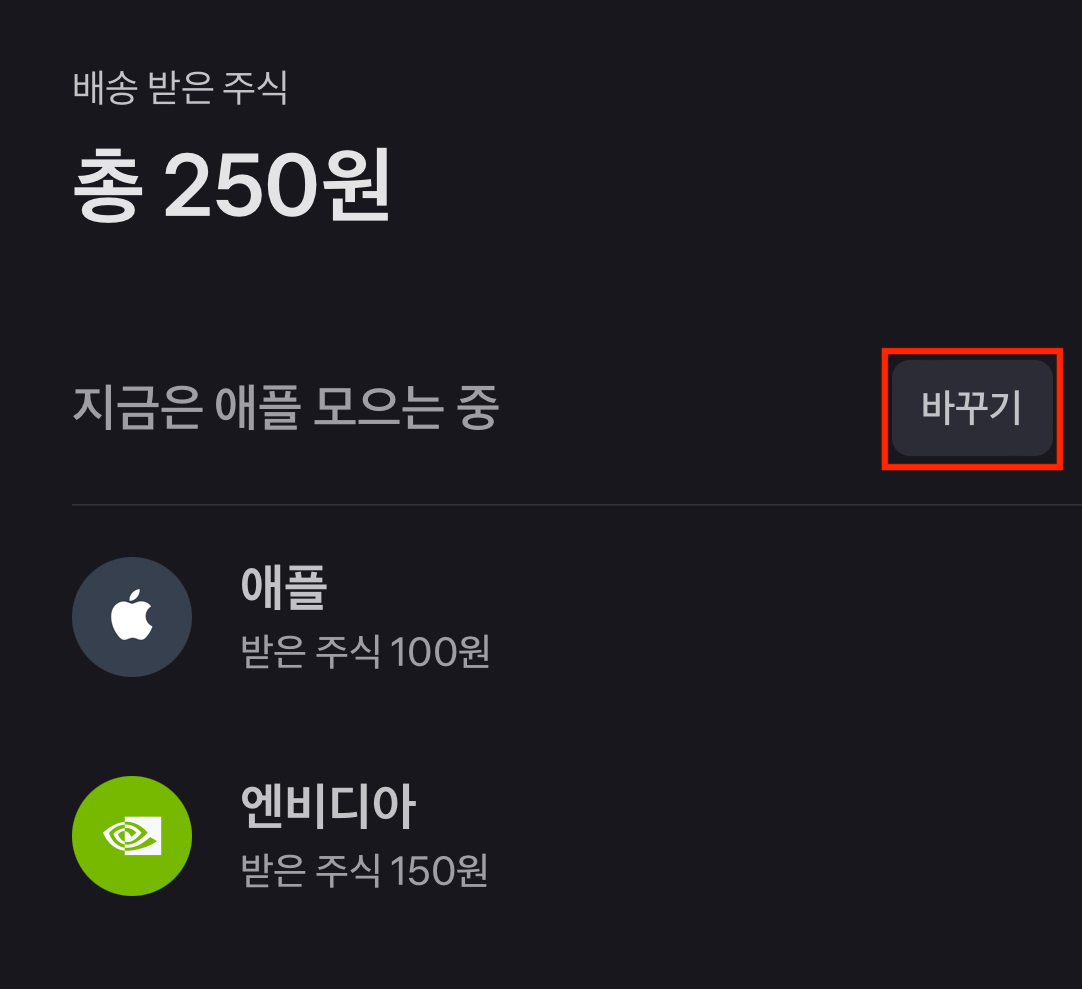 미국주식종목을 바꾸어가면서 적립도 가능한데 위 사진처럼 바꾸기 버튼을 누르면 테슬라, 애플, 엔비디아 등 원하는 미국주식을 조금씩 바꺼가며 적립이 가능하다.