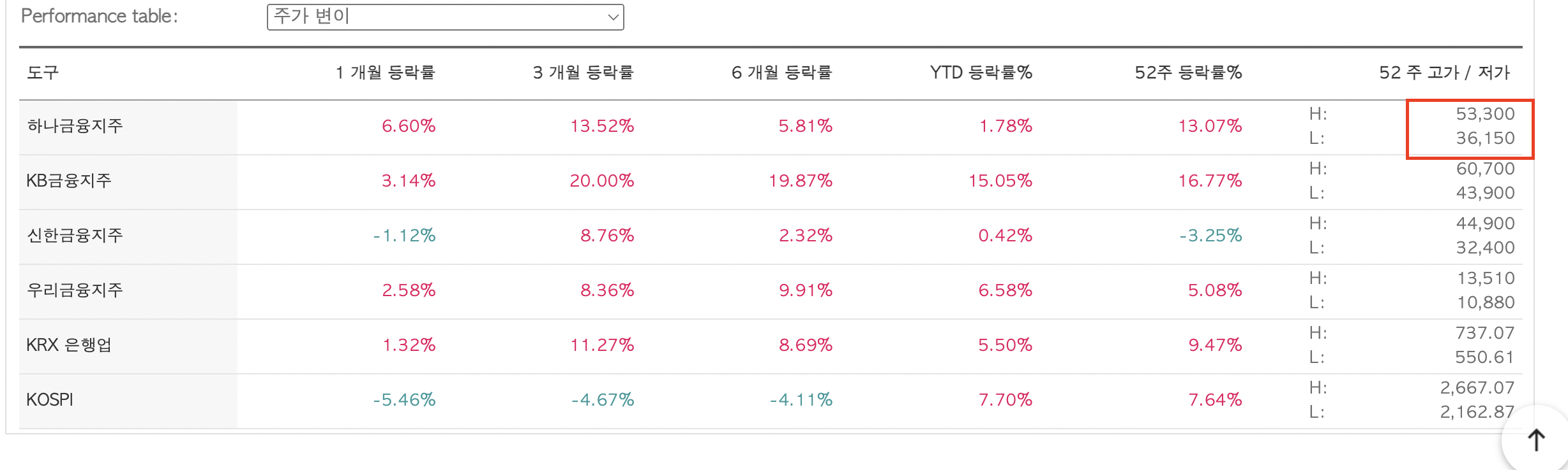하나금융의 주가는 52주 최저가 36,150원 52주 최고가 53,300원이다. 2023년 10월 6일 현재 주가는 42,800원이다.
