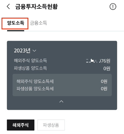 ▶미래에셋 대우증권 어플 → 관리하기 →금융투자소득 →금융투자소득현황 → 양도소득세 가계산