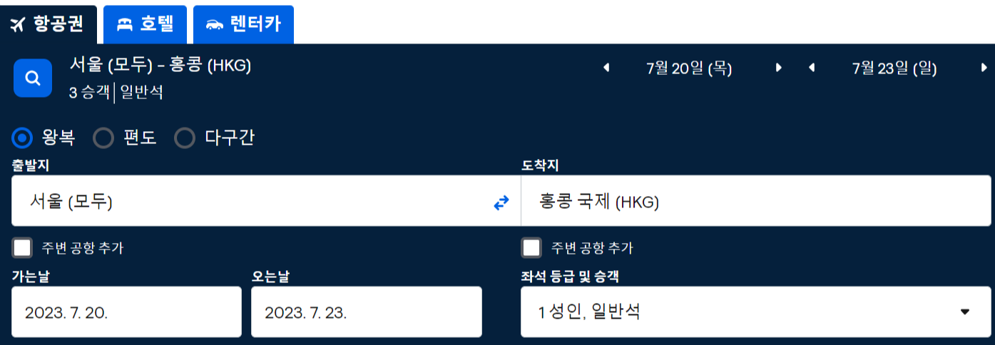 목요일 7월 초 출발 홍콩 비행기표 가격이 1인 왕복 42만원이 최저가이다. 토요일 출발 화요일 도착으로 세팅하면 1인 왕복 홍콩 비행기표 가격은 47만원선이다. 3군데 이상 비행기표 가격비교를 해보고 할인되는 가격이 다르기 때문에 홍콩 여행 날짜가 정해졌다면 수시로 비교하시고 가장 할인이 많이 되는 곳으로 신청하시면 된다. 어느 날 가격이 훅 내려가는 날이 있다. 그 때 광클릭하시면 조금 더 저렴하게 홍콩 여행을 즐기실 수 있으실거다.