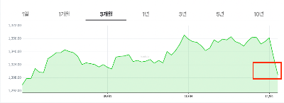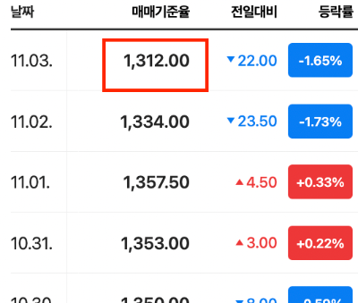 고공행진을 하던 원달러 환율이 20원 넘게 급락하며(2023년 11월 3일 기준) 올해 3월 23일 29.4원 내린이후 처음으로 이틀 연속 낙폭 35원을 기록했다.