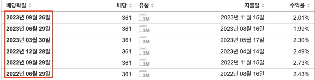 그럼 언제까지 주식을 보유해야 배당을 받을 수 있는지 위의 표를 예를 들어보면 배당기준일은 2023년 9월30일이고 배당락일은 2023년 9월 26일이다. 9월26일이 배당락일이니 그 전에 주식을 보유하고 있어야한다. 즉, 하루 전까지 보유하여야 하는데 평일을 고려하면 하루전인 2023년 9월25일까지 주식을 보유해야 배당금을 2023년 11월15일에 지급받을 수 있다는 것이다. 조금더 안전한 거래를 원한다면 배당락일 2일전까지 보유하고 있어도 좋을 듯하다.