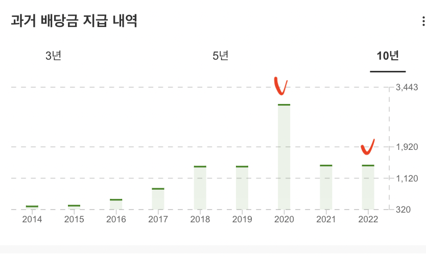 삼성전자의 과거 배당금 지급내역을 보면 2021년 9월29일 주당 3,015원의 특별배당 이후로는 361원으로 동일하게 지급되고 있다. 실적과 비교해보면 비례하는데 2020년도 주당순이익을 2020년 말 4분기 기준으로 1,364원이었는데 2023년 2분기 기준 주당순이익은 228원이니 그럴만도 하다. 반도체 감산이후 올해 말부터 슬슬 실적이 개선된다고하니 장기적으로 조금씩 적립해가는 것도 좋은 방법이겠다.