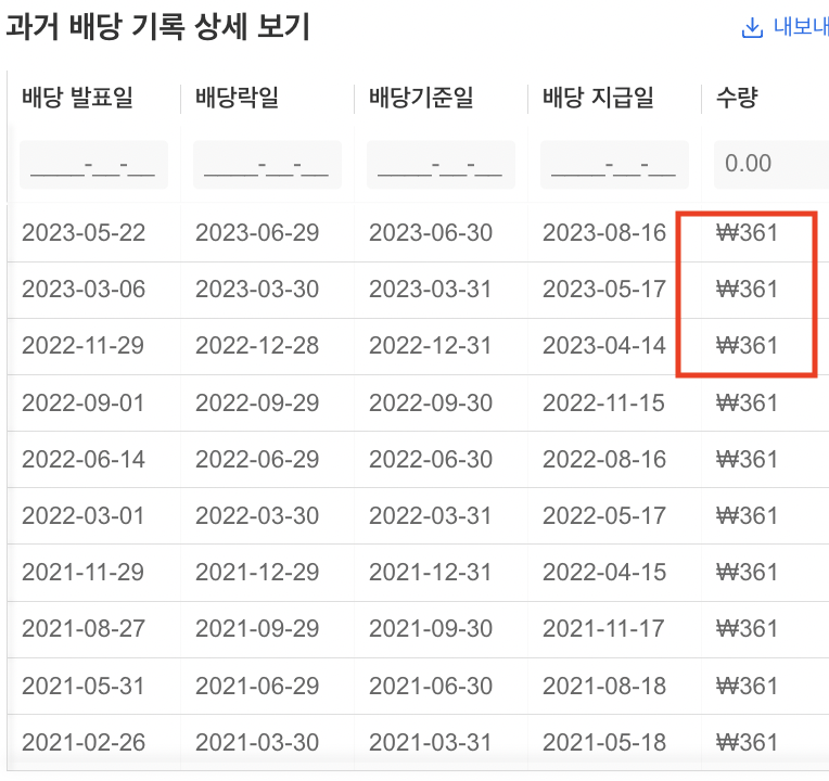 삼성전자의 과거 배당금 지급내역을 보면 2021년 9월29일 주당 3,015원의 특별배당 이후로는 361원으로 동일하게 지급되고 있다. 실적과 비교해보면 비례하는데 2020년도 주당순이익을 2020년 말 4분기 기준으로 1,364원이었는데 2023년 2분기 기준 주당순이익은 228원이니 그럴만도 하다. 반도체 감산이후 올해 말부터 슬슬 실적이 개선된다고하니 장기적으로 조금씩 적립해가는 것도 좋은 방법이겠다.