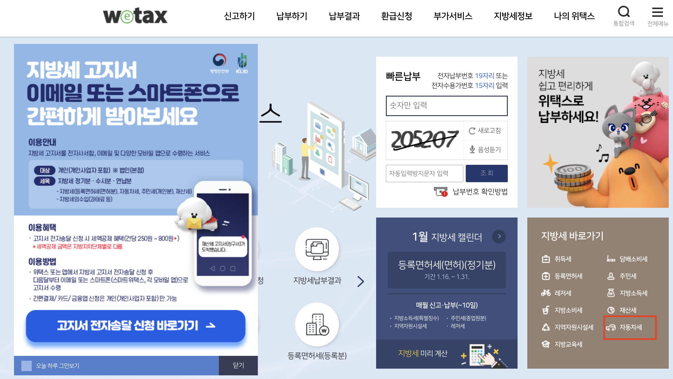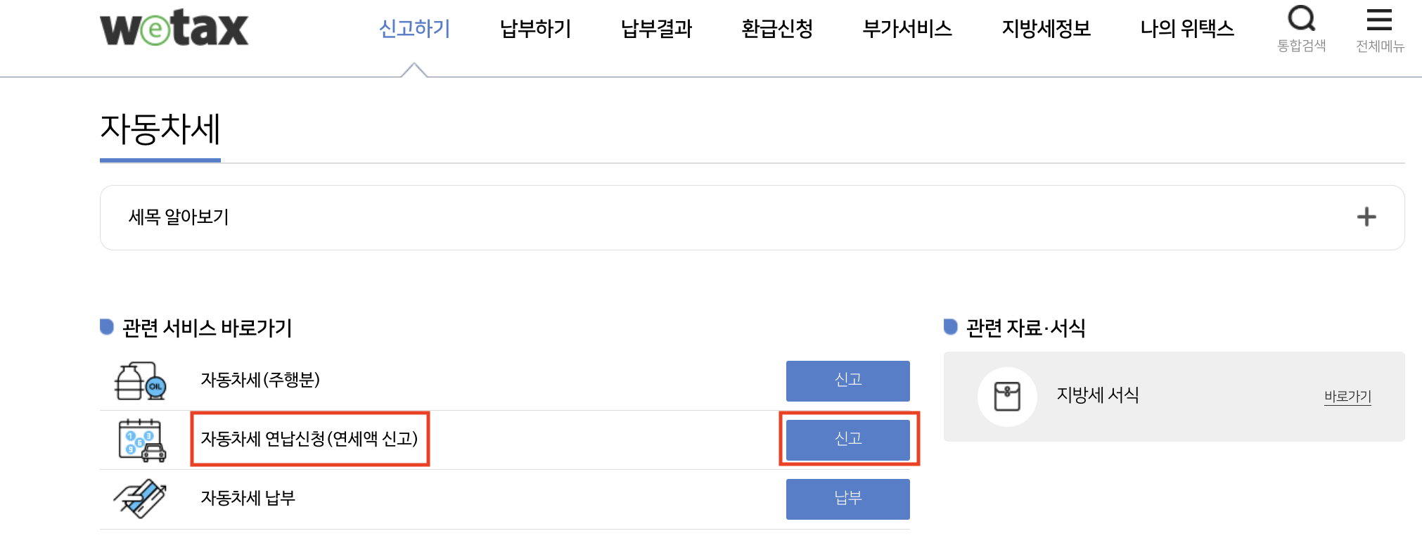 이택스: 오른쪽 상단위 전체메뉴 → 신고납부 →자동차세연납