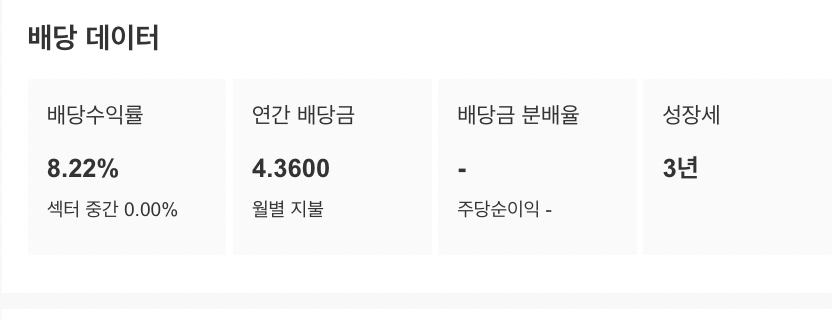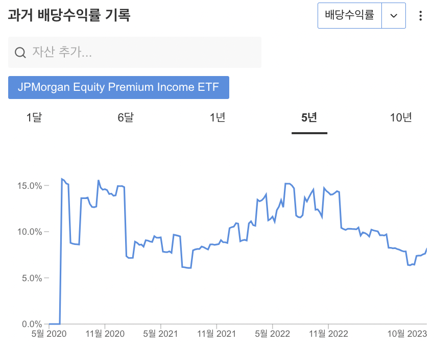 JEPI의 특성상 매달 월 배당금이 달라진다. 작년 주당 0.41~0.44달러까지 지급이 됐는데 올해는 0.36달러가 지급되고 있다. 년간 배당률이 작년 10%를 넘어서오 올해 8%수준으로 지급되고 있다.