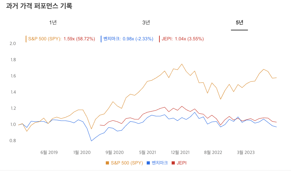 다시말해 주가가 올라고 상방이 정해져있어 위의 표에서 보는 것과 같이 S&P지수가 58%상승할 때 JEPI는 3.55% 상승률을 보였다. 주가가 오를 때 수익을 기대하기 어렵지만 하락장에서는 손실의 규모가 적다는 장점이 있다. 배당주의 특성인것처럼 가파른 수익을 기대하기 어렵지만 안정적인 배당을 가져다준다. 장점이자 단점이 되는 것이다.