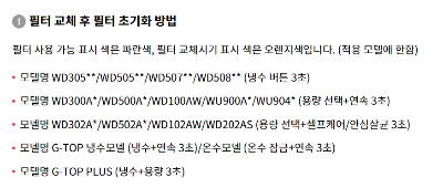 7. 세척이 끝난 후 냉수버튼 3초간 눌러 필터 사용량 초기화를 한다. (모델에 따라 초기화 방법이 다름 아래 사진참조)