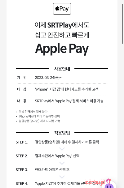 2023년 3월 24일부터 SRT PLAY에서 애플페이 결제가 가능하다. 아이폰 지갑앱에 현대카드를 등록한 고객은 이용할 수 있고 맥북환경에서는 결제가 되지 않는다.