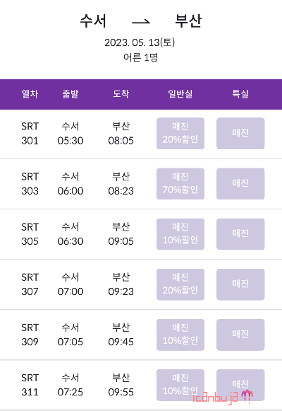 SRT 입석예매하는 방법은 인터넷이나 모바일에서는 안된다. 매표소로 직접 가서 발권할 수 있는데 아주 소량이기 때문에 직접 방문하는 방법이 최선이다. SRT PLAY에서 카카오나 네이버 간편 로그인을 하면 한 달 전부터 원하는 구간의 예매가능한 표가 보이는데 SRT열차가 생각보다 많지 않기 때문에 여행계획이 있으시다면 무조건 한 달 전에 예매하실 것을 권유드린다.